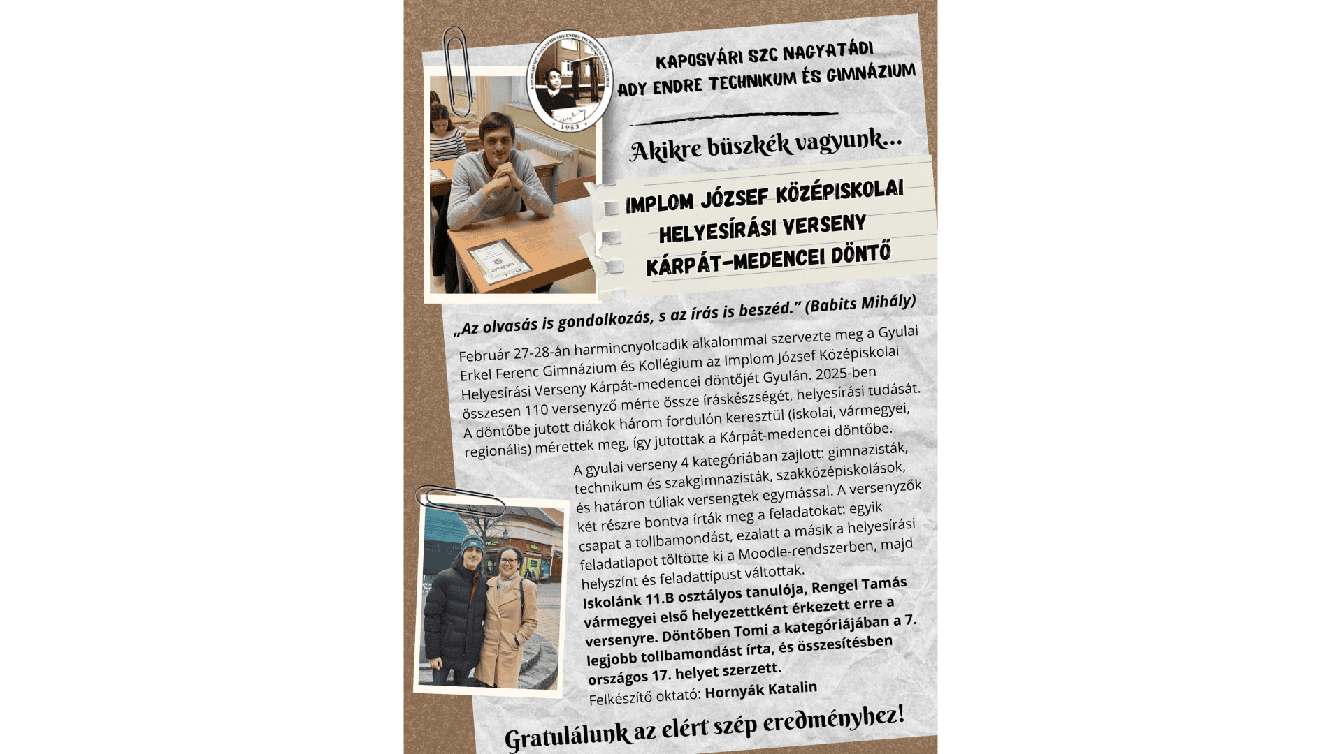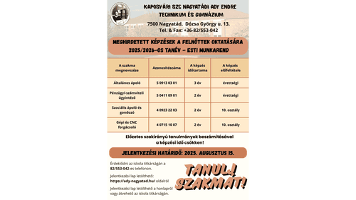 Az „Ady”. Ha Dél-Somogyban valaki ezt hallja, már hét évtizede Nagyatád és a térség legnagyobb középiskolája jut az eszébe. 1953-tól folyamatosan megújulva tanítjuk, képezzük tanulóinkat, hogy felkészülten jussanak a felsőoktatásba, modern ismeretekkel, gyakorlati tapasztalatokkal lépjenek a munkaerőpiacra.